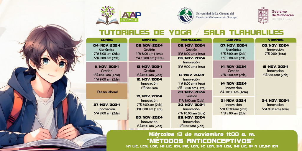 25 Oct CALENDARIO DE TUTORIALES. Estimados estudiantes el ATAP comparte con ustedes el calendario de Tutoriales de Yoga correspondiente del 04 de noviembre al 29 de noviembre del presente año.¡COMPARTE Y ASISTE!